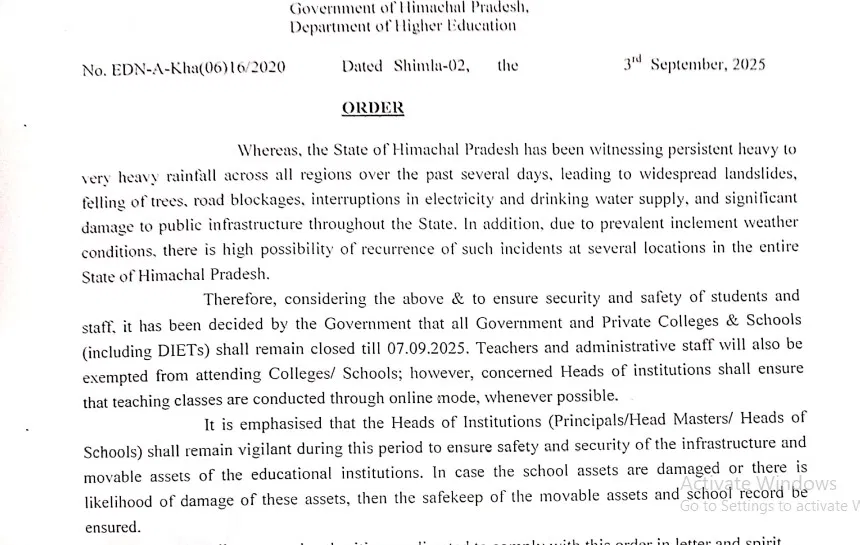 हिमाचल प्रदेश राज्य में पिछले कई दिनों से सभी क्षेत्रों में लगातार भारी से लेकर बहुत भारी बारिश हो रही है, जिसके कारण व्यापक भूस्खलन,पेड़ों का गिरना, सड़कें अवरुद्ध होना, बिजली और पेयजल आपूर्ति में रुकावटें और पूरे राज्य में सार्वजनिक बुनियादी ढांचे को काफी नुकसान हुआ है। इसके अलावा, मौजूदा खराब मौसम की स्थिति के कारण पूरे हिमाचल प्रदेश में कई स्थानों पर ऐसी घटनाओं की पुनरावृत्ति होने की प्रबल संभावना है। सरकार ने निर्देशों में स्पष्ट किया है कि छुट्टियों के दाैरान संस्थान प्रमुख शैक्षणिक संस्थानों के बुनियादी ढांचे और चल संपत्तियों की सुरक्षा सुनिश्चित करने के लिए सतर्क रहें। यदि स्कूल की संपत्ति क्षतिग्रस्त हो जाती है या इन संपत्तियों के क्षतिग्रस्त होने की संभावना है, तो चल संपत्तियों और स्कूल रिकॉर्ड की सुरक्षा सुनिश्चित की जाए।